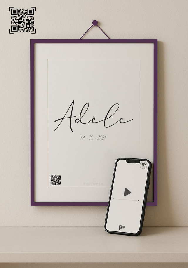 Les affiches peuvent être proposées seules, ou accompagnées d’un QR code ou d’une puce NFC (au dos de l'affiche) permettant d’accéder à un message audio, une vidéo souvenir, une galerie photo ou même un lien vers une plateforme en ligne.