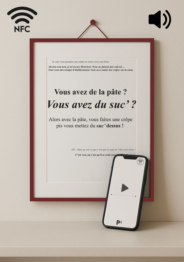 Les affiches peuvent être proposées accompagnées d’un QR code ou d’une puce NFC (au dos de l'affiche) permettant d’accéder à un contenu audio ou vidéo ( à choisir lors de la commande)